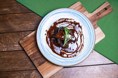 180g Pomalu pečená hovězí líčka v omáčce z červeného vína, bramborová kaše a smažená cibulka 375,-